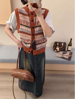 Literatur Kunst Retro-Stil Fair island Jacquard Gestrickt Frauen Herbst Winter Kontrast Farbe Gestapelte Weste Top Geometrisches Muster