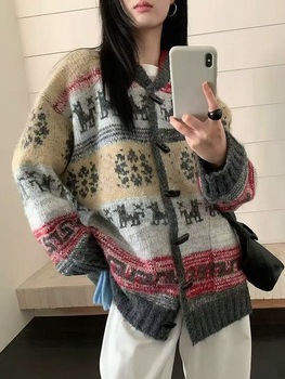 韓国のレトロな芸術的なスタイルのコントラストカラーレイジージャカードプルオーバーセーター女性の秋冬ルーズクリスマス流行のフロント